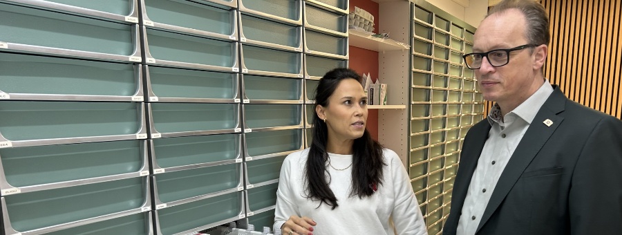 Eine Apothekerin steht gemeinsam mit einem Politiker in einem Apothekenlager. Die Frau hält eine geöffnete Medikamentenschublade in den Händen und erklärt etwas, während der Mann aufmerksam zuhört. Im Hintergrund sind zahlreiche beschriftete Medikamentenschränke zu sehen.