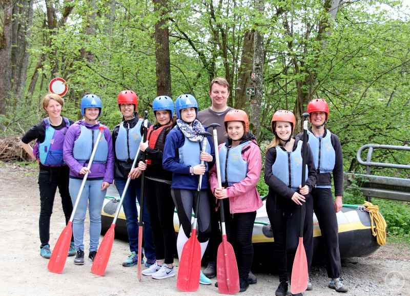 In Schwimmwesten verpackt, die Helme aufgesetzt, das Paddel im Boot, machen sich die Teilnehmer mit dem Boot auf dem Weg zum Fluss. Als Guide am Boot wird heute Elisabeth Peter unterwegs sein. Somit macht sich ein nur mit Frauen besetztes Boot auf den Weg von Gumpenried nach Gstadt. Auf dem Fluss hat immer der Steuermann das Kommando. „Wir werden das Fahren üben, das heißt, dass jede Teilnehmerin ein Stück weit das Boot steuern wird“, sagt Elisabeth bevor es losgeht. Die Teilnehmerinnen finden rasch einen Platz. Gesessen wird auf den Außenwülsten des Bootes, die Füße kommen in Fußschlaufen, „so fällt keiner leicht raus.“ Wichtig ist, dass gemeinsam gepaddelt wird. Während der Steuermann hinten sitzt und mit seinem Paddel das Boot lenkt, macht die Mannschaft die Geschwindigkeit. „Eine ruhige Fahrt ist nur möglich, wenn möglichst synchron gepaddelt wird“, betont Elisabeth Peter und auch dies werden die Teilnehmer in den nächsten zwei Stunden üben.