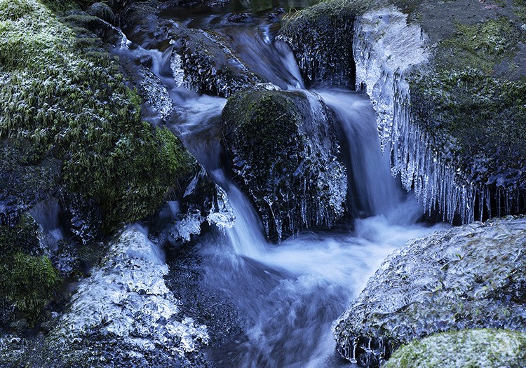 Während in den letzten Tagen tagsüber in den höheren Lagen des Bayerischen Waldes vielfach Plusgrade vorherrschten, erbrachten Nächte meist Temperaturen unter null Grad. In Schattenbereichen war es oftmals raureifüberzogen gefroren. Das Foto vom 27. Dezember zeigt zwischen Felsgestein wunderschöne Wasser-Eiskaskaden in der Saußbachklamm bei Waldkirchen.