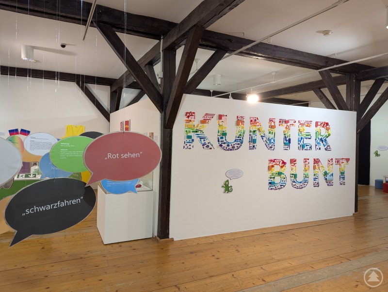 So werden die Museumsgäste direkt von einer großflächigen Installation begrüßt, die den Schriftzug „Kunterbunt“ aus den verschiedensten Kleinteilen zusammensetzt. Dazu gehören zum Beispiel Stifte, Messer, Zahnstocher, Kinderspielzeug und Haushaltshelfer in den unterschiedlichsten Farben. Diese kunstvoll arrangierten Gegenstände sind teilweise mehrere Jahrzehnte alt. Kunterbuntes kommt also nie aus der Mode - im Gegenteil. Schon immer ließen sich die Menschen von den Tönen des Regenbogens inspirieren.