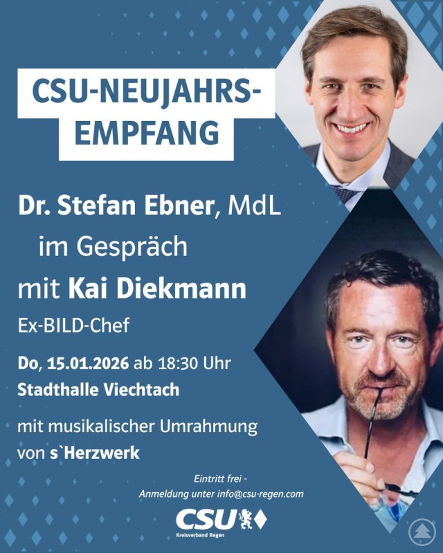 Mit einem prominenten Gast startet der CSU-Kreisverband Regen ins neue Jahr. Am Donnerstag, 15. Januar 2026, ist der frühere BILD-Chefredakteur Kai Diekmann zu Gast in der Stadthalle Viechtach.