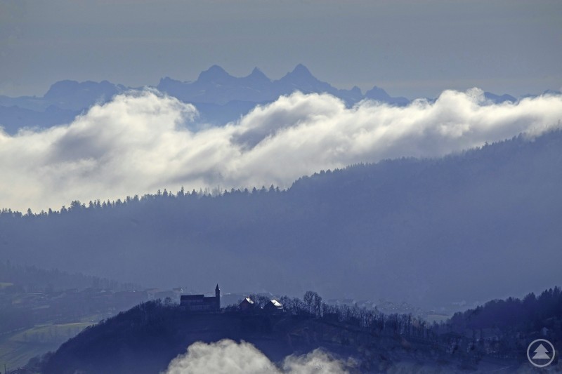 Der Blick schweift über die Wollaberger Kirche hin bis zum Alpenkamm mit dem Hohen Dachstein in der Steiermark (Luftlinie: 250 km)
