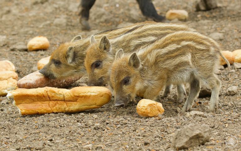 Eine kleine Zwischenmahlzeit bestehend aus Brot und Baguette stärkt die kleinen Frischlinge im Wildschwein-Gehege Neuschönau.
