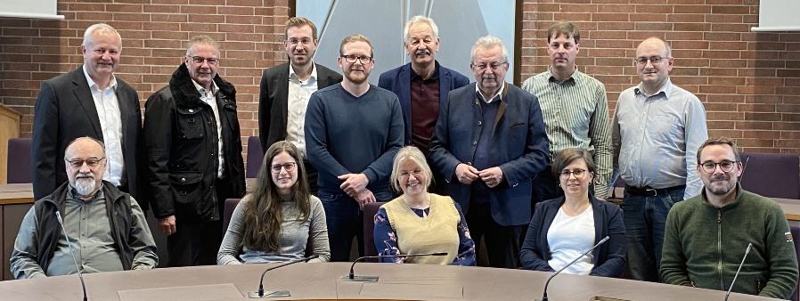 Gruppenfoto im Sitzungssaal des Landratsamtes. Mehrere Personen stehen und sitzen vor einer gebogenen Tischreihe, im Hintergrund eine Backsteinwand mit Wappen.