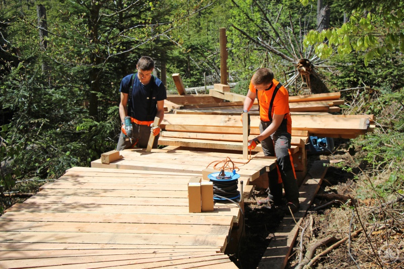 Maximilian Faschingbauer und Johannes List, Azubis beim Nationalpark, beim Bau der mittlerweile fertiggestellten Plattform nebst Bohlensteg.