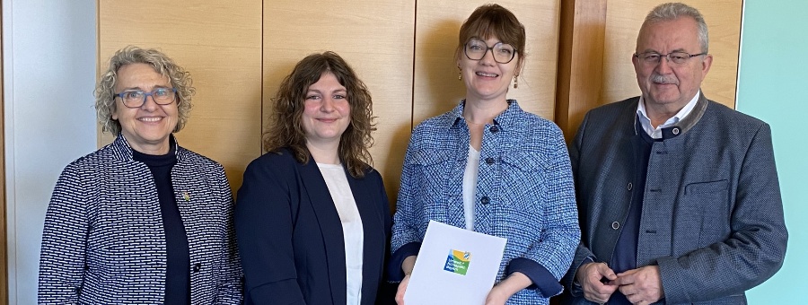 Christine Hammerschick Bürgermeisterin Steinach, Johanna Aschenbrenner, Dr. Stephanie Torkler, Landrat Josef Laumer von links bei der Übergabe der Urkunde im Büro des Landrats.