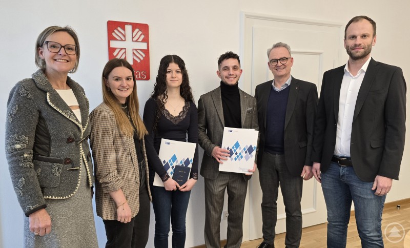 V.li. Caritas-Vorständin Andrea Anderlik, Sabrina Hoffmann, Ausbildungsleiterin, Sina-Marie Schulz, Johannes Schlappinger, Vorstand Stefan Seiderer, und Personalleiter Thomas Furthmeier.