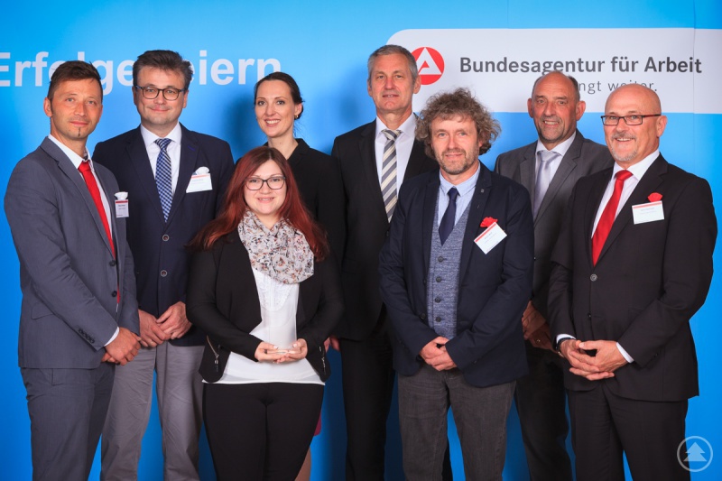 Stolz nehmen die Vertreter des Jobcenters Freyung-Grafenau den Preis für die bundesweit beste Zielerreichung 2016 vom Vorstand der Bundesagentur für Arbeit entgegen. (von links nach rechts): Markus Holzinger, Joachim Weigl, Stefanie Meininger, Valerie Holsboer (Vorstand Ressourcen), Raimund Becker (Vorstand Regionen), Armin Wolf, Detlef Scheele (Vorstandsvorsitzender) und Hans Gastinger