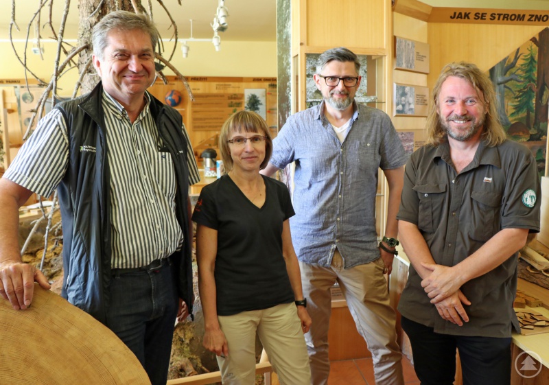 Gemeinsame Freude über den Start für die Waldwerkstatt: Nationalparkleiter Franz Leibl, Martina Kučerová (Leiterin der Umweltbildungs- und Informationszentren des Nationalparks Šumava), Christian Binder (Leiter des Hans-Eisenmann-Hauses) und Nationalparkleiter Pavel Hubený.