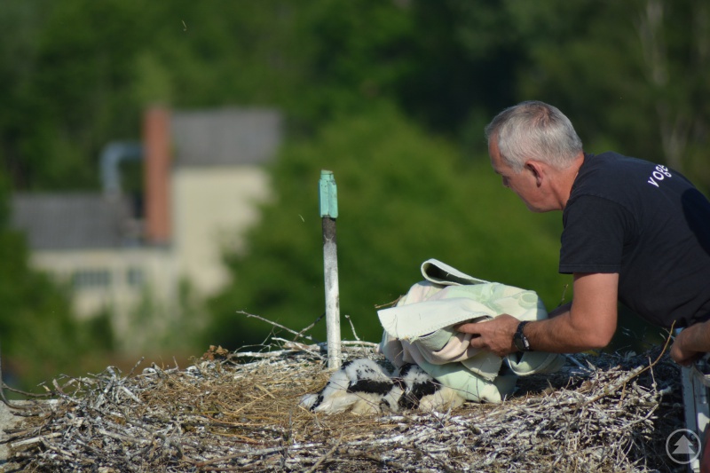 Nach wenigen Minuten konnte Markus Schmidberger, der mit der Grafenauer Drehleiter zum Nest hochgefahren wurde, die Beringung beendet. Währenddessen lag eine Decke über den Vögeln, um sie zu beruhigen.