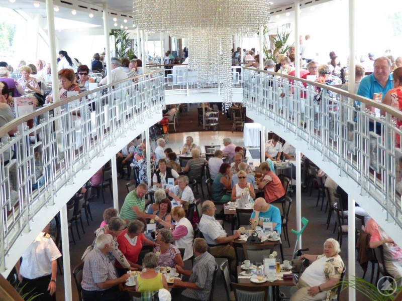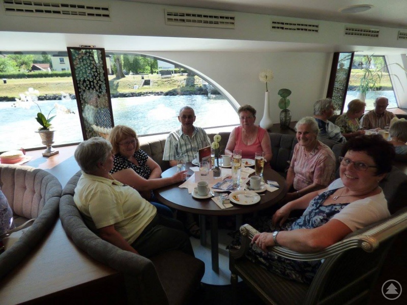 Nach Betreten des Schiffes konnte man sich der vielen, im Sonnenschein glitzernden Swarovski-Kristalle erfreuen, die durch die an diesem Tag besonders hervortretende Sonne besonders schön funkelten. Die Fahrt auf der Donau führte dann an Passau vorbei über Obernzell, durch die Schleuse Jochenstein, über Engelhartszell bis zur "Schlögener Schlinge" und zurück. Dabei genossen alle Teilnehmer die fröhliche und gesellige Runde, die dazu einlud, von Tisch zu Tisch zu wandern und bei Kaffee und Kuchen bzw. Strudel, nette Gespräche mit den vielen bekannten Gesichtern aus den insgesamt zwölf Gemeinden zu führen.