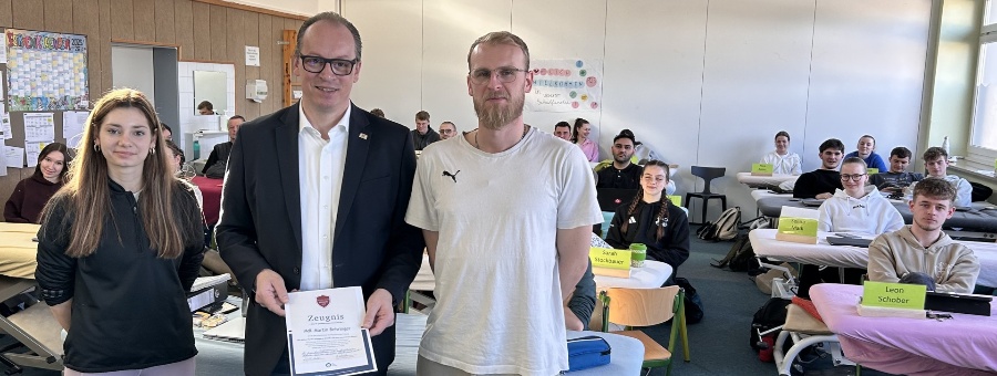 Als Dank für einen Vormittag direkten Sozialkundeunterricht gab es für MdL Martin Behringer ein Schulzeugnis mit Lob für besonders informatives Betragen von Jasmin Grübl und Tobias Tahedl als Klassensprecher.