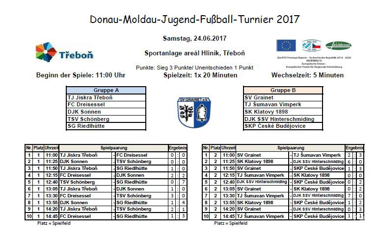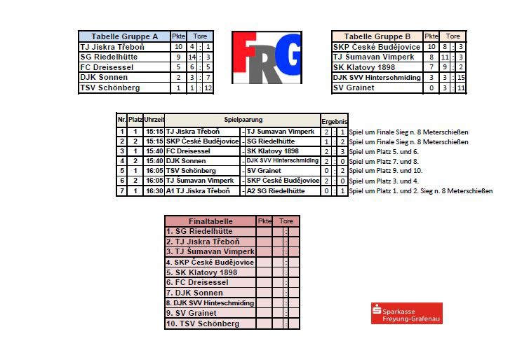 In einem spannenden Finalspiel (Spielstand am Ende der regulären Spielzeit 0:0) mit anschließendem 7-Meter-Schießen besiegte die E-Junioren-Mannschaft der SG Riedlhütte die Gastgebermannschaft TJ Jiskra Třeboň vergangenen Samstag mit zwei Toren durch Simon Weinberger und Toni Hobelsberger. Im kleinen Finale, also im Spiel um Platz 3, gewann TJ Šumavan Vimperk mit 2:0 gegen SKP České Budějovice. Für die Gastgebermannschaft der Vorrunde, den SV Grainet, lief es diesmal nicht optimal. Lediglich im Spiel um Platz 9 konnten sie sich erfolgreich gegen die Mannschaft des TSV Schönberg durchsetzen. Insgesamt überzeugten die tschechischen Mannschaften in dieser Finalrunde mit sehr guten Leistungen und konnten so die Plätze 2 bis 5 der Finaltabelle belegen.