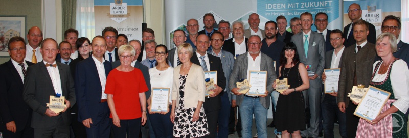 Dem Ruf in den Grünen Saal des Brauereigasthofes Falter waren an diesem Sommerabend nicht nur die auszuzeichnenden und bereits ausgezeichneten Preisträger, sondern auch zahlreiche Lokalgrößen aus Wirtschaft und Politik gefolgt: Regens Landrat Michael Adam und ARBERLAND REGio-Geschäftsführer Herbert Unnasch freuten sich, neben Bürgermeistern, Behördenleitern und Vertretern der Wirtschaftsverbände auch Bezirkstagspräsident Dr. Olaf Heinrich begrüßen zu dürfen. „In der Vornacht ist Dr. Heinrich Vater eines gesunden Jungen geworden“, gratulierte Landrat Adam. „Umso mehr ehrt es uns, dass er sich diese Prämierungsfeier nicht hat nehmen lassen.“