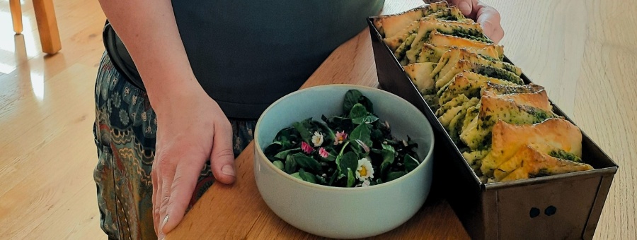 Sabrina Danböck zeigt das fertige Bärlauch Zupfbrot und den Wildkräutersalat