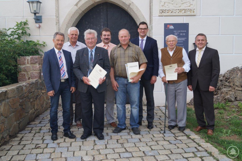 (v.l.): Bürgermeister Helmut Vogl (St. Oswald), Vermessungsdirektor Erwin Knott (Vermessungsamt), Johann Aufschläger, 2. Bürgermeister Max Ertl (Waldkirchen), Franz Berger, Landrat Sebastian Gruber, Alois Nowak und 3. Bürgermeister Herbert Schiller (Freyung)