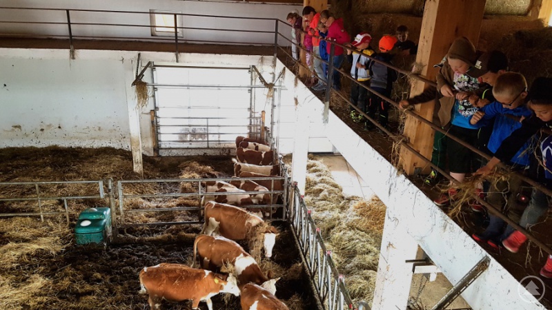 Die „leitende Professorin“, Erlebnisbäuerin Christiane Zeintl, hatte für alle Betreuer ein stärkendes Frühstück vorbereitet, sodass alle voller Energie in den Tag starten konnten – schließlich stand einiges auf dem Programm. Nachdem sich alle kennen lernen konnten, fand ein Rundgang auf dem Bauernhof statt. Es wurden die Kälber besucht, die die Kinder füttern durften, die Hofpferde durften gestreichelt werden und auch die Mutterkühe wurden begrüßt und konnten gefüttert, gebürstet und gestreichelt werden. Besonders die trächtige Kuh „Molli“ kam in den Genuss ausgedehnter Massageeinheiten, was nicht nur die Kuh, sondern auch die Kinder freute. Auf ihrer Erkundungstour über dem Bauernhof hatten die Kinder außerdem die Möglichkeit, den Hof-Fischen „Hallo“ zu sagen und sich ihnen gegenüber mit Futter wohlgesinnt zu zeigen. Jedes Kind erhielt anschließend einen Bauernhofforscherpass, mit dem sie an verschiedenen Stationen Stempel sammeln konnten. In Aktion traten sie zunächst bei der Herstellung der eigenen Butter, indem sie Sahne in Flaschen füllten und stark schüttelten. Aber auch beim Wettmelken, Hufeisen verzieren - wobei der Glitzerfaktor bei den Mädchen eine auffällig große Rolle spielte - und auch beim Ponyreiten mit Amelie, der ältesten Tochter des Hofes, waren sie gefordert. Das gemeinsame Ökomemory-Spiel forderte die Forscher- und Entdeckerqualitäten der Kids ganz besonders, da sie unterschiedliche Gegenstände suchen mussten (z.B. etwas Weiches oder Spitziges). Viel gelacht wurde beim „Goaßstecha“ (mit verbundenen Augen eine Zielscheibe mit einem Stock treffen).