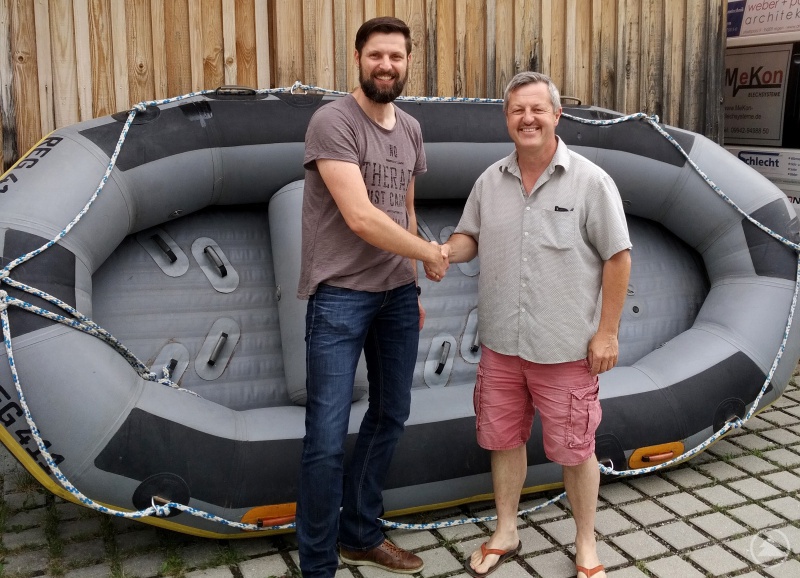 Mittlerweile einsatzbereit ist das große Schlauchboot vom Kanu-Club Regen, welches Spartenleiter Robert Sommer (rechts) dem Kommunalen Jugendpfleger Dirk Reichel für die Jugendarbeit im Landkreis zur Verfügung stellte.
