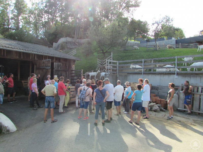 Teilnehmer und Ziegen lauschen interessiert der Hofbesitzerin vom Bio-Ziegenhof Eilmansberger