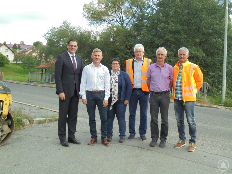 Landrat Sebastian Gruber an der Baustelle in der Ortsdurchfahrt Schönanger mit Bürgermeister Alfons Schinabeck, Abteilungsleiterin Judith Wunder, Bauhofleiter Hans-Hermann Eder, Techniker Paul Baar und Bauaufseher Erich Grünzinger.