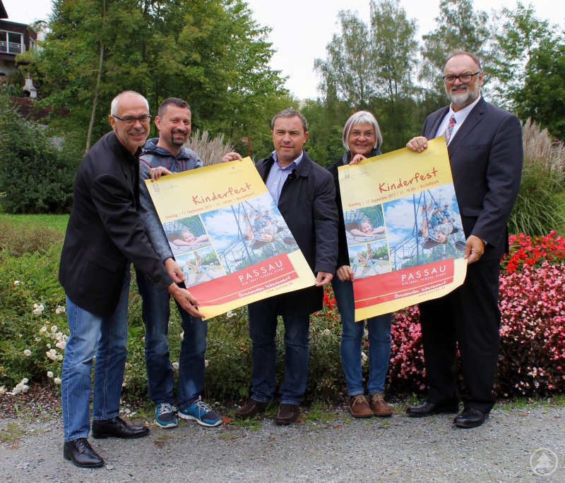 Oberbürgermeister Jürgen Dupper freut sich mit (von links) Jugendamtsleiter Alois Kriegl, Stadtjugendpfleger Edmund Kriegl, Peter Niedermeier (Leiter der Dienststelle Arbeit und Qualifizierung, Ehrenamt und Senioren) sowie Maria Höltl (Geschäftsführerin Stadtjugendring) auf das Kinderfest am Sonntag im Bschütt-Park.