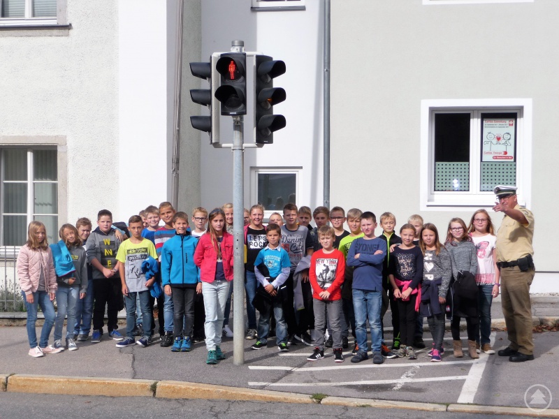 "Die Ampel ist nicht umsonst an dieser Stelle!" Polizeioberkommissar Alexander König und die neuen Fünftklässler beim Fußgängerüberweg in der Nähe der Bushaltebucht bei der Agip Tankstelle (Rosenauer Straße)