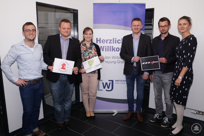 Die Vorstandschaft präsentiert die zum „Unternehmen des Jahres 2016/2017“ nominierten Firmen. AVS Römer aus Grafenau, die Brauerei Lang aus Freyung und das Familotel Schreinerhof aus Schönberg. V.L. Stephan Philipp, Stefan Behringer, Heidi Behringer (1. Vorsitzende), Frank Jemetz (stv. V.), Rainer Jungwirth, Magdalena Schindler