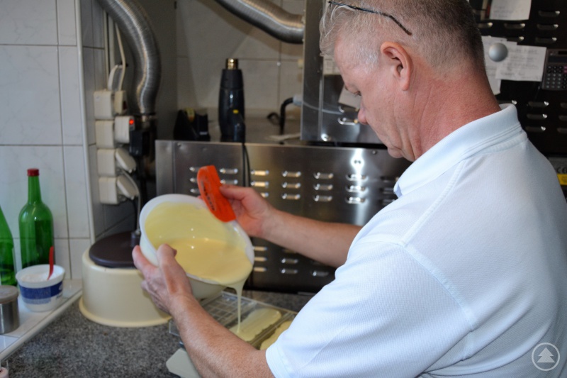Ja, das stimmt in etwa. Um korrekt zu sein, ist es die Kuvertüre, also eine Mischung aus Kakao, Kakaobutter und Zucker. Unsere Kuvertüre beziehen wir ausschließlich aus Belgien. Höchste Qualität, weltweit geschätzt. Bei der Herstellung wird die Kuvertüre, die in Form von kleinen Drops angeliefert wird, zunächst geschmolzen. Dann temperier ich sie. Das ist der wichtigste Abschnitt im gesamten Prozess. Hierzu bedarf es viel Erfahrung. Denn nur wenn sie die ideale Temperatur hat, erhält die Schokolade ihren seidenmatten Glanz. Schließlich folgt die Verarbeitung. Wir schöpfen die Schokolade per Hand in die Form und veredeln sie gegebenenfalls mit weiteren Zutaten.