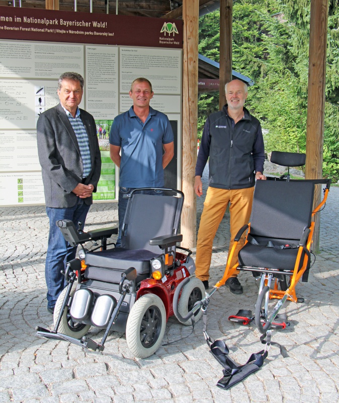 Freuen sich über die neuen Hilfsmittel für Nationalpark-Besucher mit Handicap: Nationalparkleiter Franz Leibl (von links), Christian Kremer von der Erlebnis Akademie und Umweltbildungsreferent Lukas Laux vor einem Elektro- und einem Wanderrollstuhl.