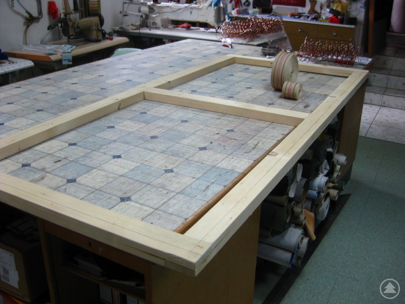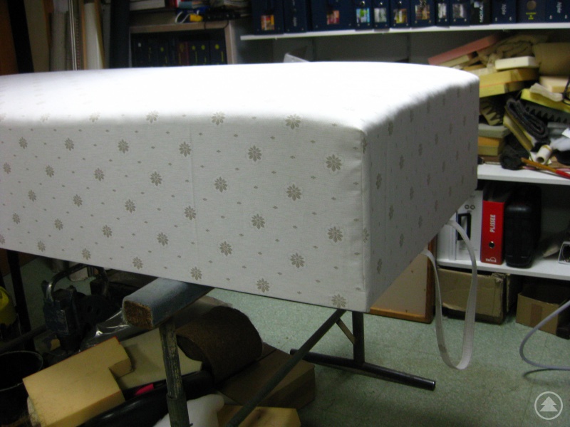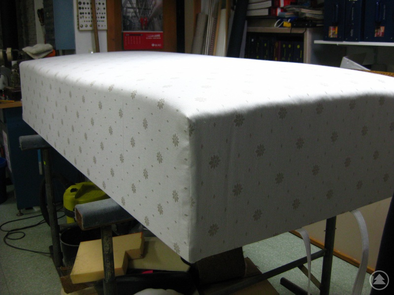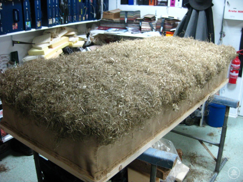 Ein rundum gesetzter Kantendraht verstärkt das Konstrukt. Dann verkleidet Roth das Gebilde mit Juteleinen, das am Rahmen festgenagelt wird. Unten bleibt es offen zur Belüftung. Danach setzt Franz Xaver Roth Leiterstiche auf die Matratze. Die Palmfaser Afrik wird als Polsterung auf das Leinen pikiert und mit der Hand verzupft.