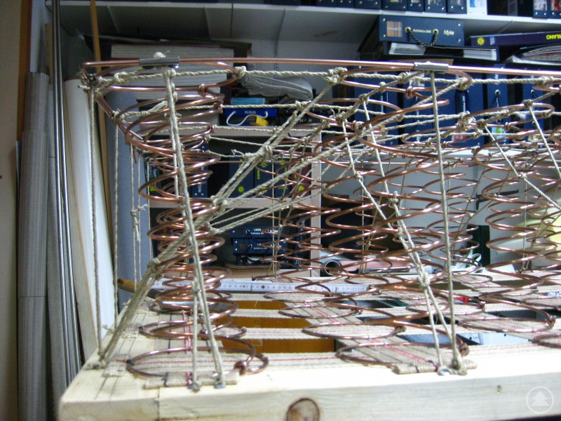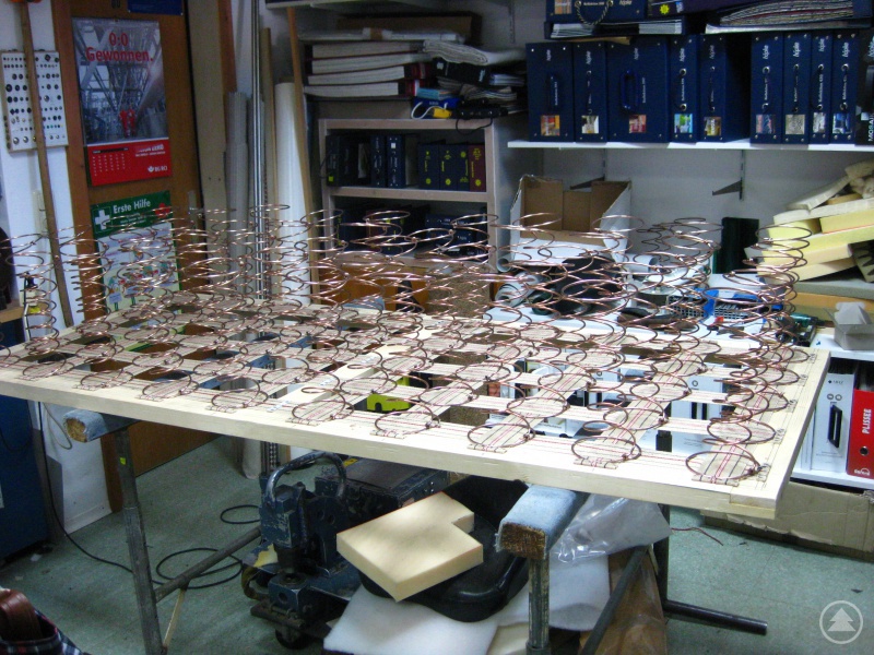 Auf diesen Rahmen befestigt er eine Jutegurtung. Dann näht und klammert er 50 Doppelkegelfedern auf, bei einer ein mal zwei Meter großen Matratze.