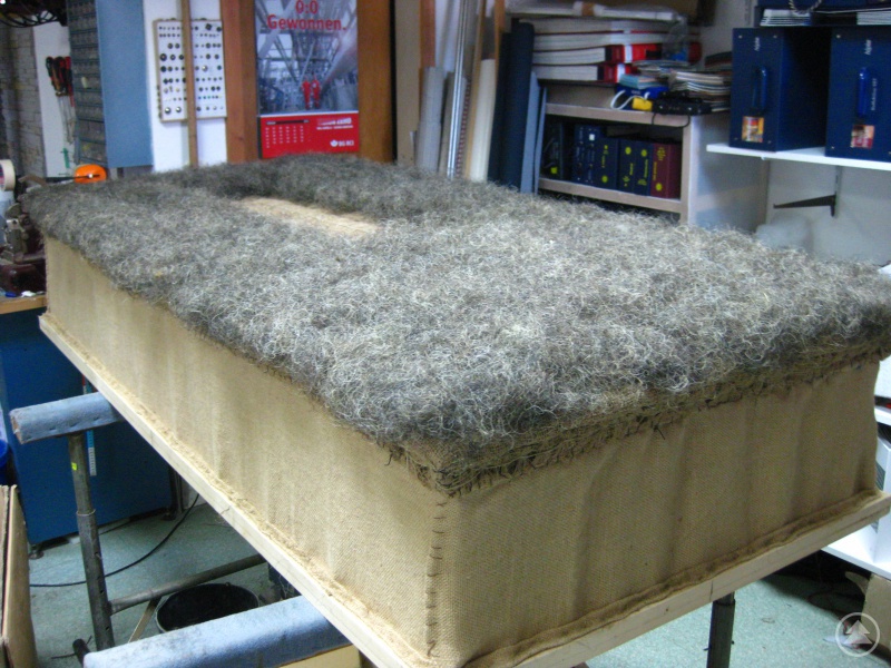 Darüber verspannt der Sattler Faconleinen, fadengerade mit Heftstiften am Rahmen. Er durchnäht das Polster, damit es zu einem Verbund wird. Nun werden die Kanten mit Afrik aufgefüllt und am Kantendraht angenäht. Zur weiteren Formgebung garniert Roth die Kante mit Hanfgarn. Es folgt eine feine Rosshaarauflage, die Unebenheiten ausgleichen soll. Da Rosshaar keine Feuchte aufnimmt, eignet es sich besonders für Bettmatratzen.