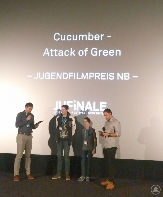 Mit Ihrem Film „Cucumber-attack of green“ erhielt die Filmgruppe „#Gurke“ nicht nur viel Applaus sondern auch einen Niederbayerischen Jugendfilmpreis: stellvertretend für die Filmgruppe waren Matthias Sterr (2.v.l.) und Jan-Laurin Frey (2.v.r) gemeinsam mit Laudator Martin Wagner (Geschäftsführer KJR Freyung-Grafenau) und Moderator der JUFINALE Moritz Höcher auf der Bühne.