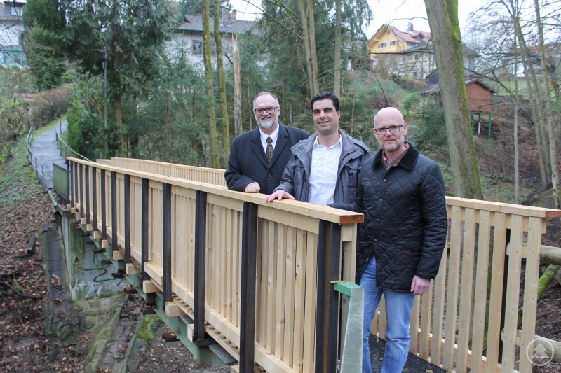 Oberbürgermeister Jürgen Dupper (links) überzeugt sich mit (von rechts) Baureferent Wolfgang Seiderer und Bauhof-Leiter Markus Weiherer-Steimer von den gelungenen Arbeiten am Gunthersteig.