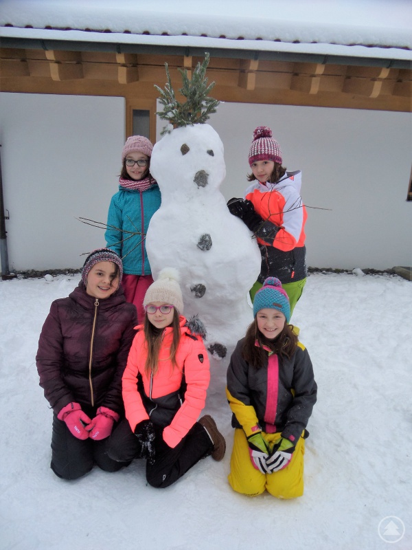 Carmen, Fiona, Franziska, Laura und Tamara freuen sich: so einen großen Schneemann hätten sie zu Hause nicht bauen können.
