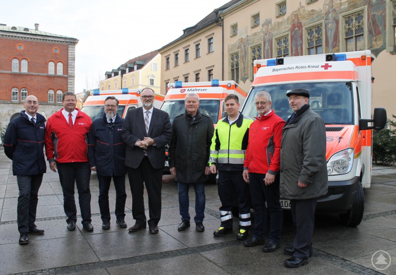 Dem Zweckverband für Rettungsdienst und Feuerwehralarmierung Passau (ZRF) ist es gelungen, mit den Krankenkassen die interimsmäßige Stationierung von zwei weiteren Rettungswagen in den Gemeinden Eging am See (Landkreis Passau) und Riedlhütte (Landkreis Freyung-Grafenau) und die interimsmäßige Ausweitung des Rettungswagen-Stellplatzes in Aidenbach (Landkreis Passau) auf künftig 24 Stunden am Tag zu vereinbaren. Mit dem Betrieb dieser Rettungswagen wurden das Bayerische Rote Kreuz (BRK), die Malteser Rettungsdienst gGmbH (MHD) und die IMS Rettungsdienst GmbH beauftragt. Die Verantwortlichen fuhren kürzlich mit ihren Fahrzeugen am Rathausplatz in Passau vor, um sich beim Verbandsvorsitzenden, Oberbürgermeister Jürgen Dupper, vorzustellen.