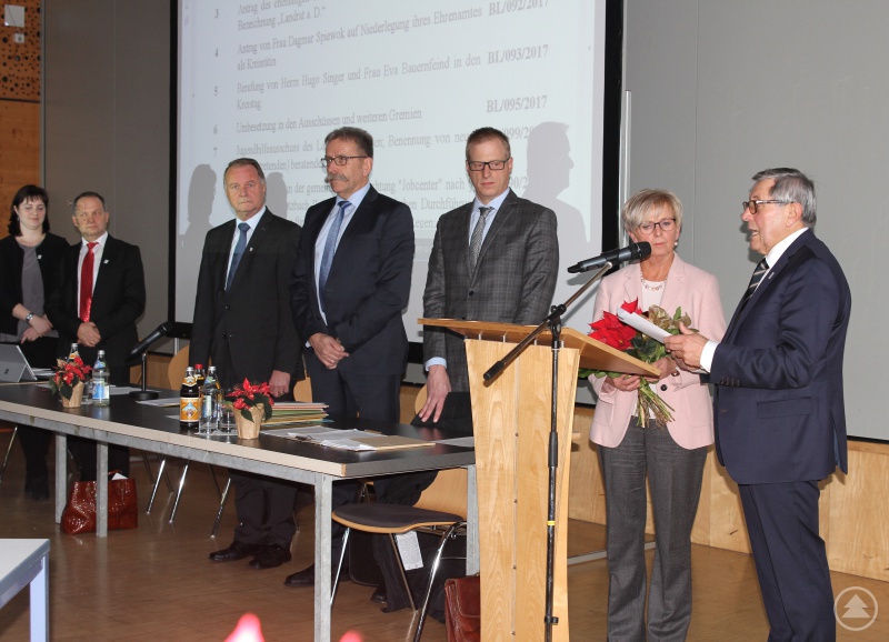Mit Personalien ging es weiter. Die Kreisräte entließen die Grünen-Kreisrätin Dagmar Spiewok einstimmig aus dem Amt, nachdem sie dies aus persönlichen Gründen beantragt hatte. Auch hier gab es eine Urkunde vom Landkreis. Mit einem Geschenk und einem Blumenstrauß wurde Spiewok von Röhrl verabschiedet. Röhrl stellte in einer kurzen Ansprache fest, dass mit der Grünen-Rätin auch eine Kämpferin für die Frauenrechte den Kreistag verlässt. Sie wünschte für die Zukunft alles Gute.