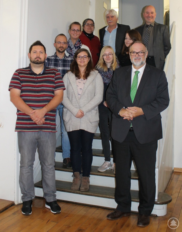 Oberbürgermeister Jürgen Dupper (1. Reihe, rechts) freut sich mit Michael Maier (1. Reihe, von links), Stefanie Kocher, Daniel Druskat (2. Reihe, von links), Sabine Hölzlberger, Renate Oberleitner, Ausbildungsleiterin Claudia Hepp (3. Reihe, von links), Personalrätin Sabine Schmied-Recha sowie der Personalamtsleitung mit Josef Bauhoffer und Herbert Zillinger. Nicht auf dem Foto: Julian König.