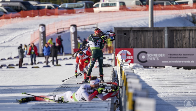 Gänzlich unbeeindruckt hiervon zeigte sich Jean Guillaume Beatrix aus Frankreich: Er absolvierte die 20 Kilometer - mit nur einem Fehler im stehenden Anschlag - in 52:31 Minuten. Dicht auf den Fersen blieb ihm Petr Pashchenko. Der Russe ließ am Schießstand ebenfalls nur eine Scheibe weiß. Bronze holte Vladimir Chepelin aus Weißrussland. Der Deutsche Philipp Horn belegte Rang 8, während vier Schießfehler Lokalmatador Florian Graf vom WSV Eppenschlag auf Platz 14 zurückwarfen.