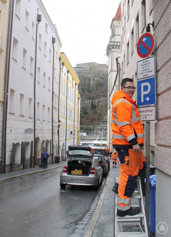 Daniel Schindler vom städtischen Bauhof beim Anbringen der neuen Beschilderung in der Schrottgasse.