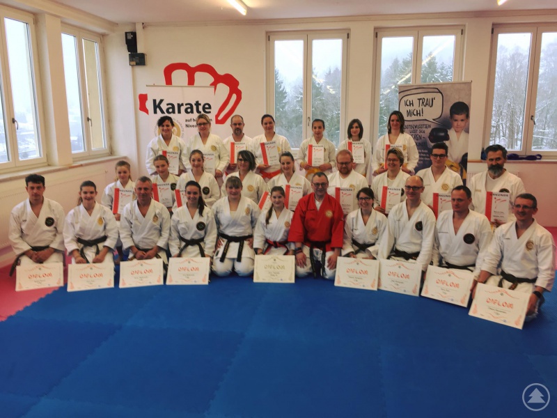 Alle Teilnehmerinnen und Teilnehmer haben die Prüfung bestanden. Diese setzt sich aus verschiedenen Prüfungselementen zusammen. So mussten die Prüflinge sogenannten Basis-Übungen (der japanische Begriff lautet Kihon Renshu) zeigen. Danach wurden die ersten Techniken in Bewegung (Shiho Waza Kata) abgefragt, gefolgt vom Scheinkampf gegen imaginäre Gegner (Kata) und dem Freikampf (Jiyu Kumite). Den Abschluss bildeten die Partner-Übungen und die Anwendungen aus der Selbstverteidigung (Bunkai). Den theoretischen Prüfungsteil bauten die Prüfer bereits in den Unterrichtsbetrieb mit ein, so dass die Prüflinge ihr Wissen über traditionelles Karate ebenfalls unter Beweis stellen konnten.