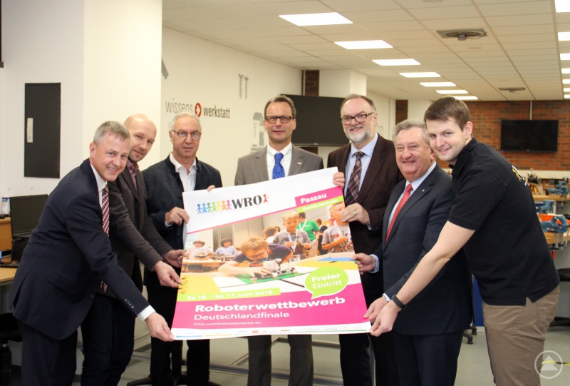 Am 16. Juni 2018 steigt das Deutschlandfinale der Roboterolympiade in Passau, für die Vorbereitungen erfolgte jetzt der Startschuss. Im Bild von rechts, Markus Fleige vom Veranstalter TECHNIK BEGEISTERT e.V., Landrat Franz Meyer, Oberbürgermeister Jürgen Dupper, Schirmherr Dr. Armin Bender von der msg systems ag, wiwe-Vorsitzender Dr. Manfred Schwab, wiwe-Leiter Ralf Grützner und wiwe-Vorstand Gernot Hein.Am 16. Juni 2018 steigt das Deutschlandfinale der Roboterolympiade in Passau, für die Vorbereitungen erfolgte jetzt der Startschuss. Im Bild von rechts, Markus Fleige vom Veranstalter TECHNIK BEGEISTERT e.V., Landrat Franz Meyer, Oberbürgermeister Jürgen Dupper, Schirmherr Dr. Armin Bender von der msg systems ag, wiwe-Vorsitzender Dr. Manfred Schwab, wiwe-Leiter Ralf Grützner und wiwe-Vorstand Gernot Hein.