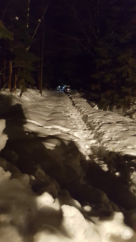 Dr. Bodo Stössenreuther und Mathias Simmet machten sich jeweils rechts und links des Baches auf den Weg. Mathias Simmet konnte nach kurzer Zeit umdrehen, da die Spur im Schnee endete. Bodo Strössenreuther informierte die Kameraden, dass wegen des tiefen Schnees zur Rettung auf keinen Fall ein Fahrzeug wie Motorschlitten oder ATV eingesetzt werden kann, sondern die Rettung auf jeden Fall zu Fuß mit einem Akia erfolgen muss.