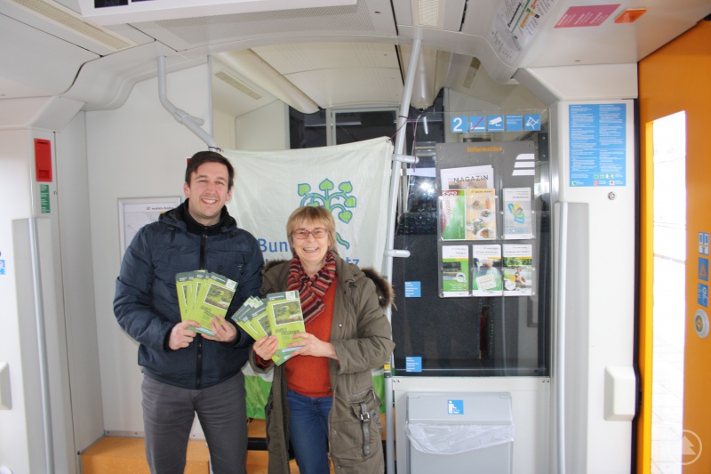 Ab sofort fahren die aktuellen BN-Jahresprogramme in der Waldbahn mit. Marketingmitarbeiter Michael Pfeffer von der Länderbahn und Christina Wibmer, Geschäftsstellenleiterin der BN-Kreisgruppe Regen, sorgen für die Verteilung der druckfrischen Jahresprogramme in der WBA 4.