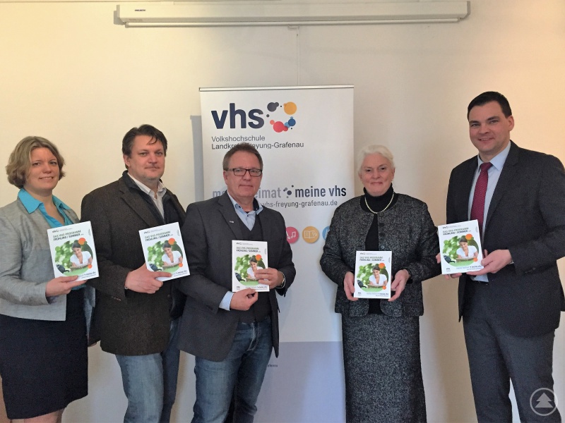 Das neue rund 500 Vorträge, Kurse und Seminare umfassende Semesterprogramm Frühling/Sommer 2018 der Volkshochschule (vhs) des Landkreises Freyung-Grafenau ist da. Die ersten noch druckfrischen Exemplare wurden Landrat Sebastian Gruber durch die ehrenamtliche vhs-Leiterin Anna Mitterdorfer, vhs-Geschäftsführer Michael Dietz und dem Pädagogen-Team vorgestellt.