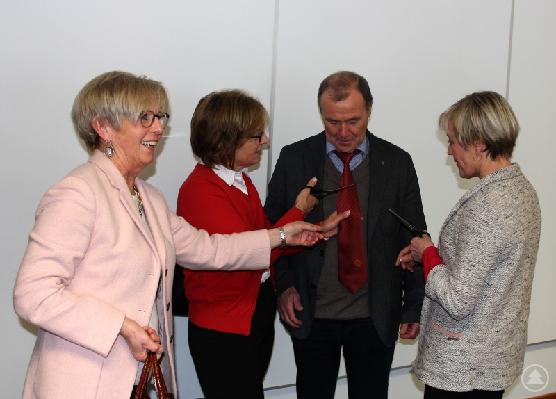 Teisnach. Nach der Bürgermeisterdienstkonferenz ging es Hermann Brandl, dem Vorsitzenden des Bayerischen Gemeindetages im Landkreis Regen an den Kragen; mehr sogar noch: Hildegard Feldigel, die Leiterin der Kommunalaufsicht im Landratsamt Regen, griff zur Schere. Unterstützt wurde sie von der Achslacher Bürgermeisterin Gaby Wittenzellner (re.) und von Landrätin Rita Röhrl (li.). Die drei Frauen nutzen das Recht des „unsinnigen Donnerstags“ und kürzten kurzerhand die Krawatte von Hermann Brandl. Der nahm´s mit Humor: „Da bin ich selber schuld, wenn ich an so einem Tag einen Binder trage.“