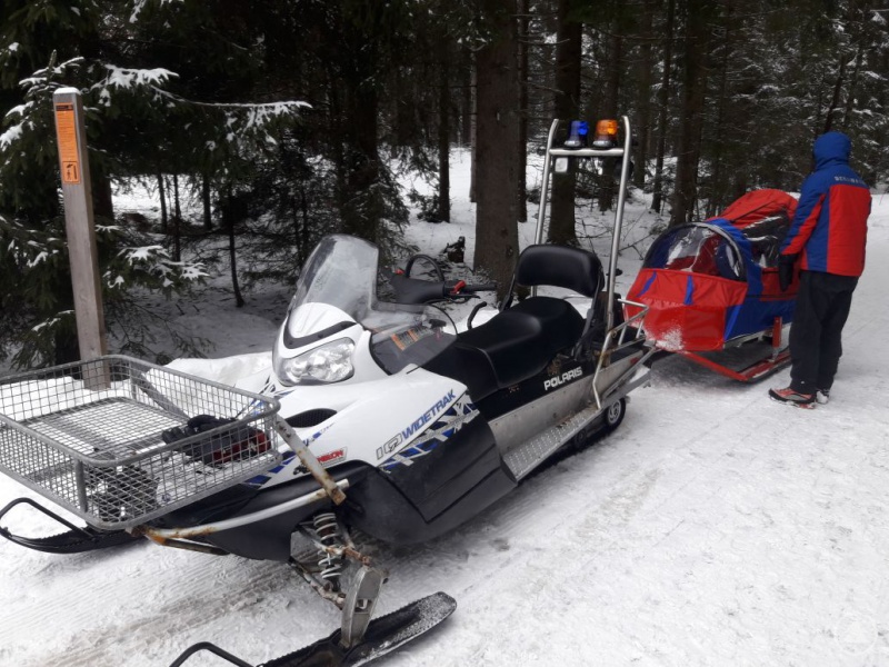 Bei der Ankunft der Bergretter hatte sich die Besatzung des bereits anwesenden Rettungswagens des IMS ( International Medical Services ) Riedlhütte schon zu Fuß zur Patientin aufgemacht. Die knapp 79 - jährige Urlauberin wurde vom sie begleitenden Sohn, der Arzt ist, zusammen mit den Sanitätern erstversorgt, die Bergretter kümmerten sich noch um den entsprechenden Kälteschutz, lagerten sie im Bergesack und transportierten sie mit dem neuen Nachläufer auf ihren eigenen Wunsch zum Auto ihres Sohnes.