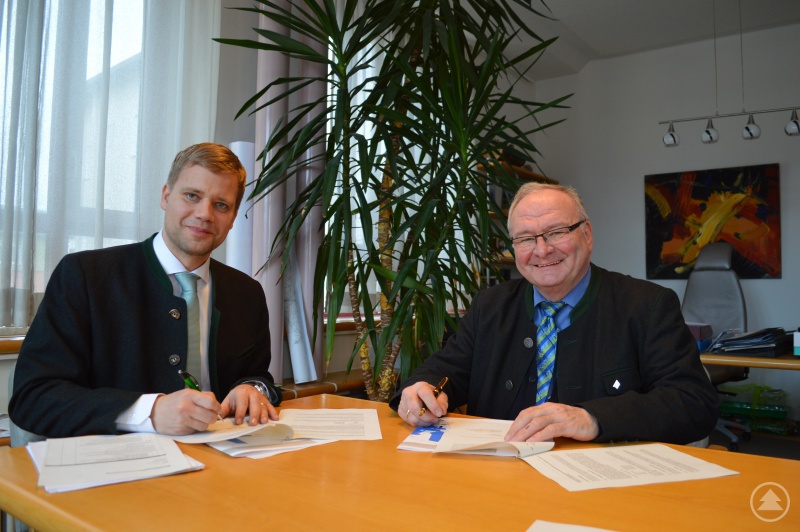v. l.: Dr. Olaf Heinrich (1. Bürgermeister der Stadt Freyung) und Roland Albert (Vorsitzender Bayerische Landesgartenschau GmbH) bei der Unterzeichnung des Durchführungsvertrages.