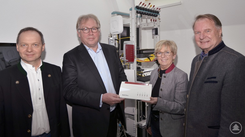 Landrätin Rita Röhrl beim FRITZ!Box-Hersteller - Gruppenfoto beim Rundgang durch die Software-Entwicklung WLAN der FRITZ!-Produkte. Im Bild: Günther Weinberger, Büroleiter der Landrätin, Ulrich Müller-Albring, Geschäftsführer Vertrieb der AVM GmbH, Rita Röhrl, Landrätin des Landkreises Regen, Willi Killinger, Stellvertretender Landrat.