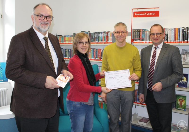 Oberbürgermeister Jürgen Dupper (von links), Katja Reitmaier (Stadträtin und Vorstandsmitglied bei pro familia Niederbayern e.V.), Uwe Kollmorgen (Leiter der Europabücherei Passau) und Dr. Bernhard Forster (Kulturreferent der Stadt Passau) freuen sich über die Zertifizierung und die Übergabe der „proSt – pro Stillen“-Urkunde an die Europabücherei Passau.Oberbürgermeister Jürgen Dupper (von links), Katja Reitmaier (Stadträtin und Vorstandsmitglied bei pro familia Niederbayern e.V.), Uwe Kollmorgen (Leiter der Europabücherei Passau) und Dr. Bernhard Forster (Kulturreferent der Stadt Passau) freuen sich über die Zertifizierung und die Übergabe der „proSt – pro Stillen“-Urkunde an die Europabücherei Passau.
